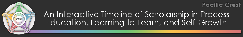 This timeline presents key scholarship since 1990, sorted first by year and then by topic. Most scholarship associated with each topic, including books, publications, articles, modules, etc., is available in its most recent edition as linked content so that you may browse the documents themselves. In the case of curricula in current use, the link offers an e-flip version for viewing. Seminal publications NOT produced or published by Pacific Crest appear in yellow text.